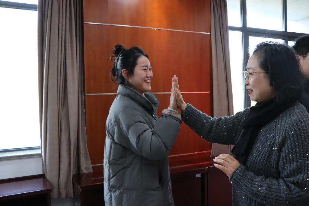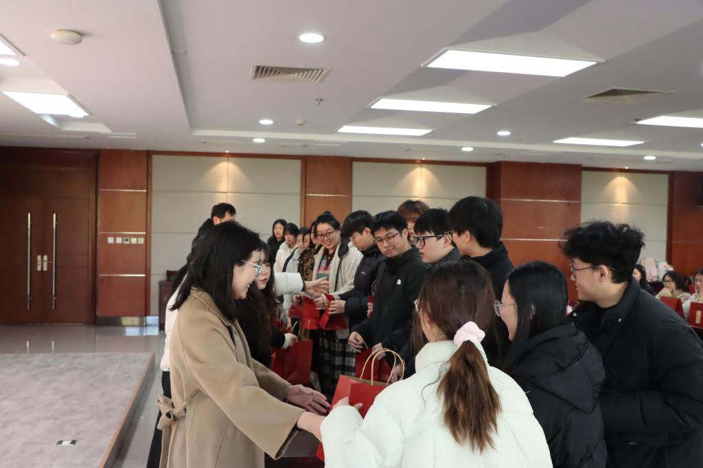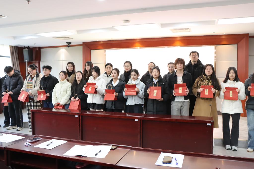 在温馨的氛围中,全体领导、老师为考研学子逐一发放精心准备的考研福袋。福袋内承载着学院的关怀与期许,寓意“福气加持、逢考必过”。学子们手持福袋与老师们亲切合影,镜头定格下这一充满力量与温情的瞬间,成为考研路上珍贵的记忆。