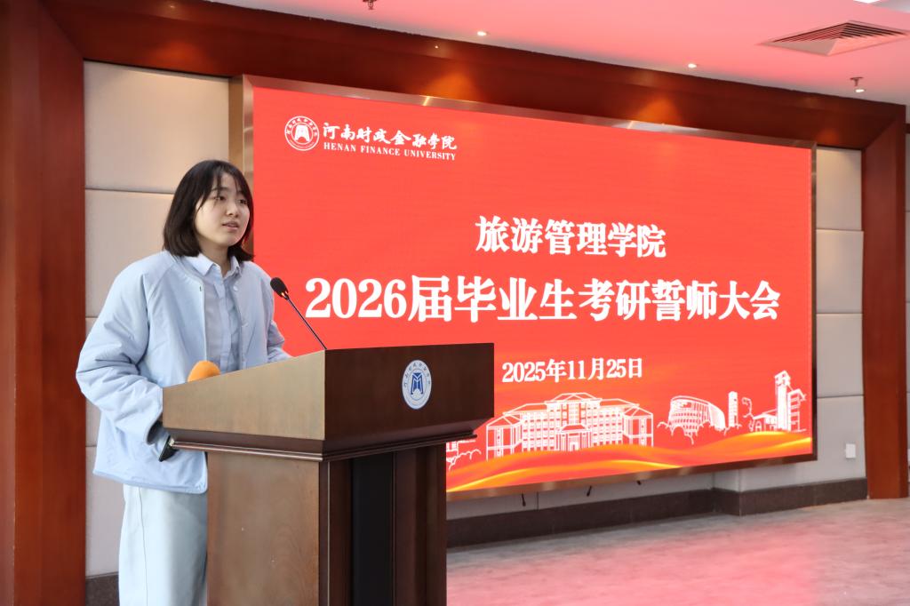 大会伊始,考研学子代表王娜、杨星雨上台发言。她们分享了备考路上的坚持与感悟,表达了对理想院校的执着追求和“破釜沉舟、一战成硕”的坚定决心,言语间的热血与信念感染了在场每一位师生。
