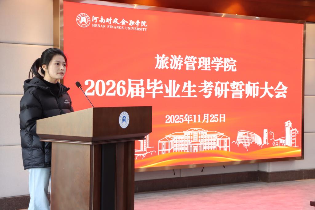 随后,新生代表张铎静登台发言,她表示,学长学姐们的拼搏姿态是校园中最动人的风景,愿以之为榜样,同时衷心祝愿各位学长学姐披荆斩棘、金榜题名,在考研战场上绽放光彩。