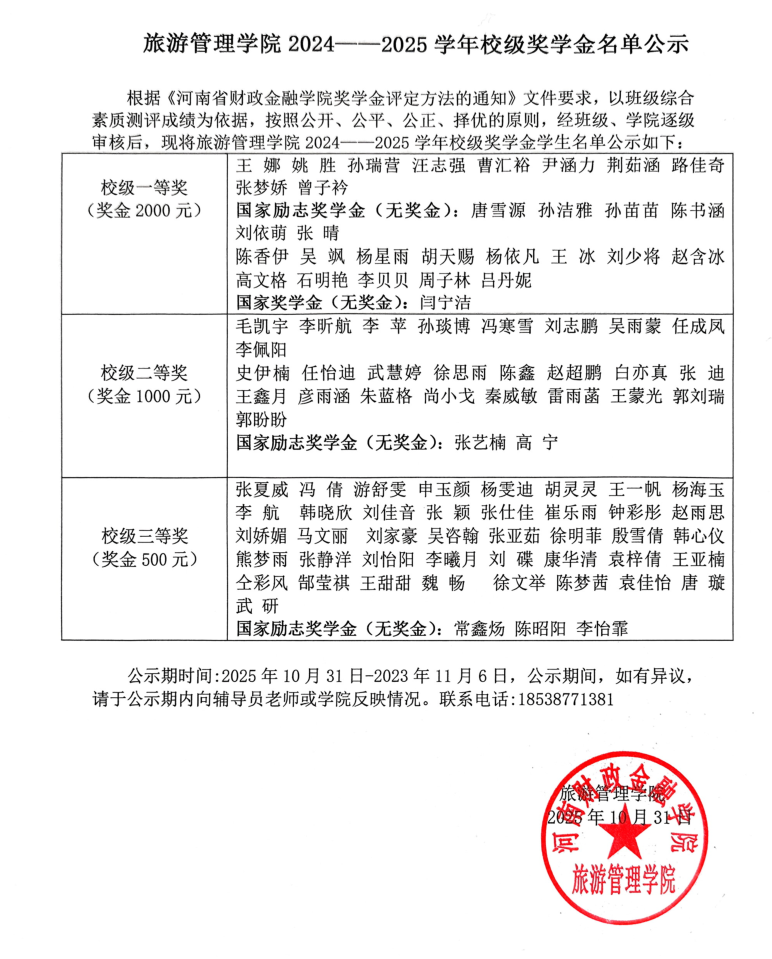 太阳成集团tyc97282024—2025学年校级奖学金名单公示